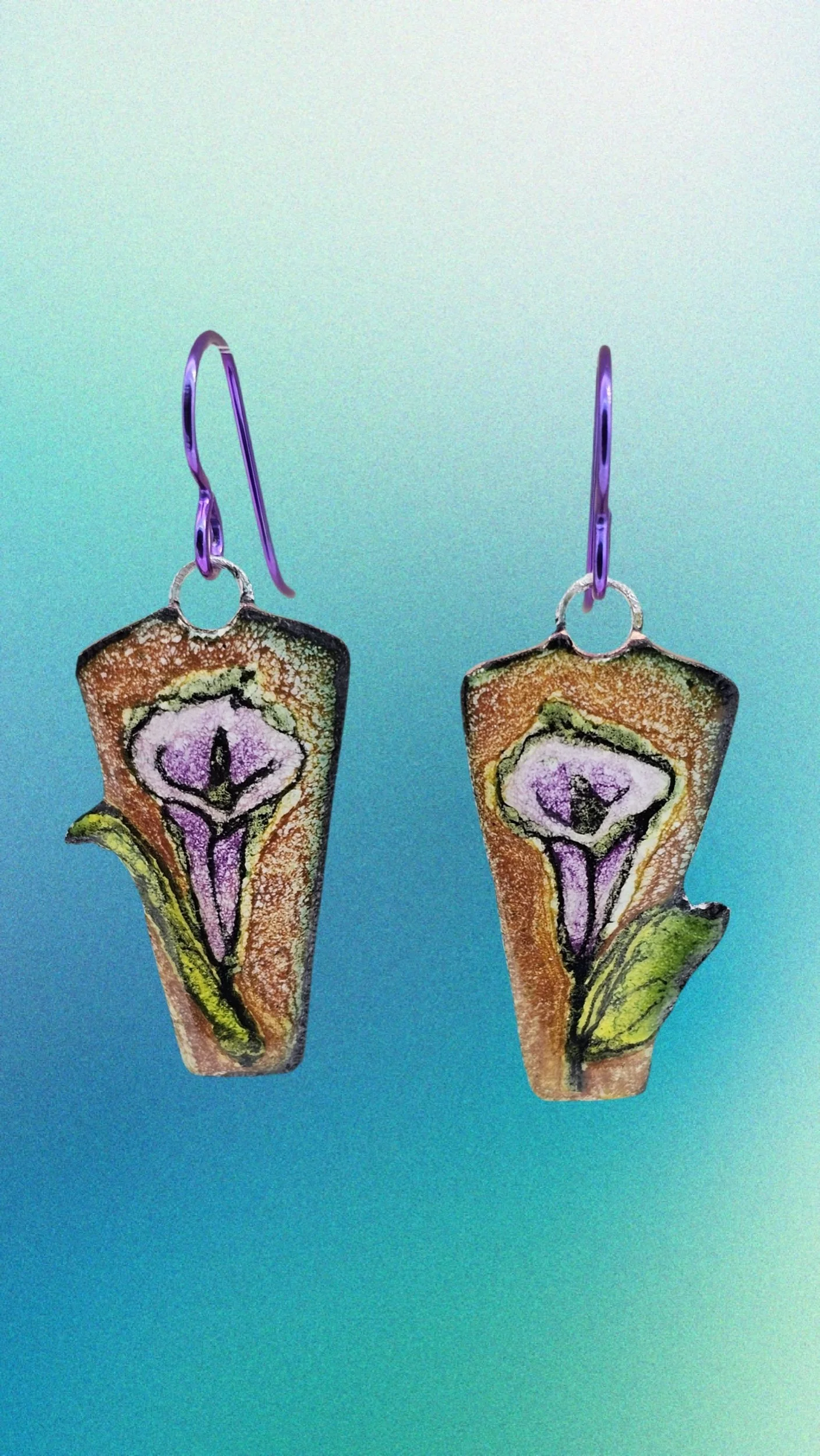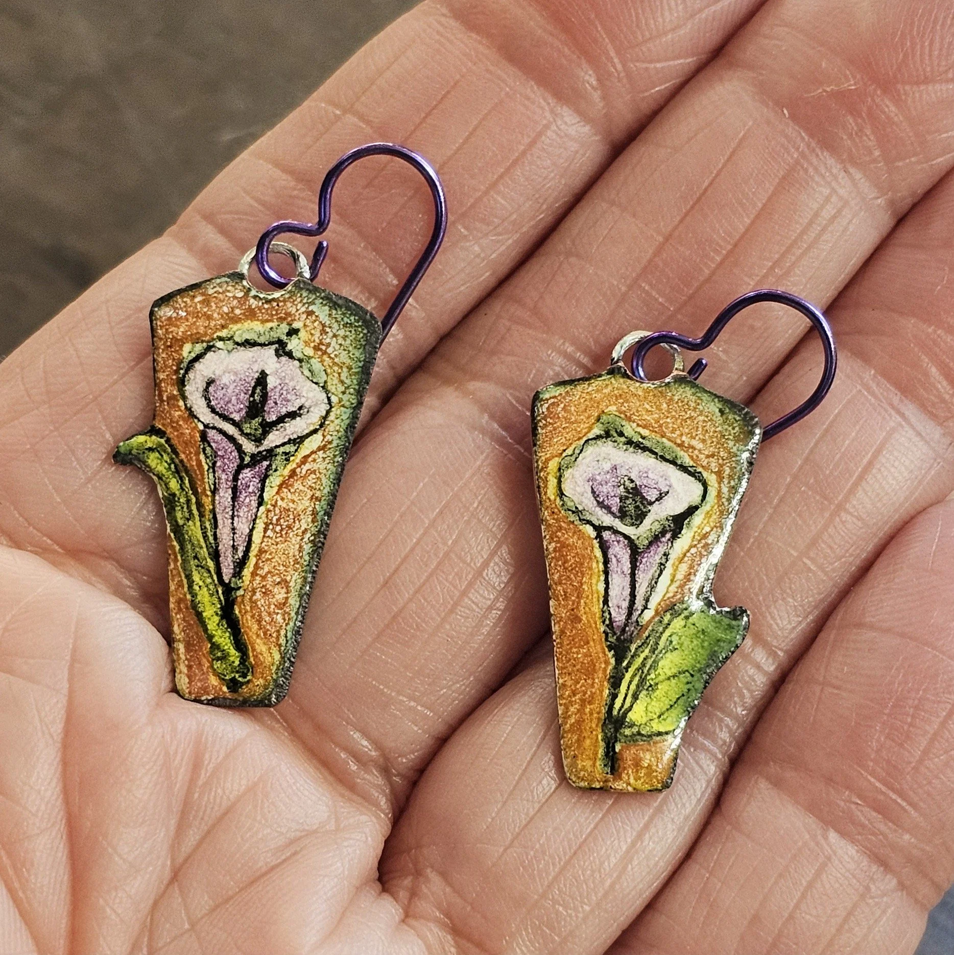 These earrings feature whimsical single lillies in spring colors executed with kiln fired enamel on copper. The earwires on these pieces are niobium which color coordinate. The drop from the bend to the bottom is approx 1.5”